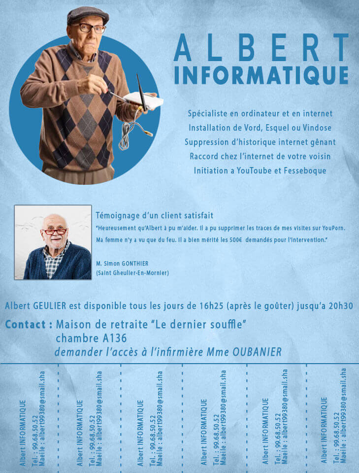 Nous profitons également de ce modeste espace pour faire part à l’opinion publique de notre indignation vis-a-vis des accusations scandaleuse du quotidien Shalf-Matin qui a sous-entendu de façon très insistante dans leur numéro de mardi dernier que nous « piquions » les pensionnaires qui ne s’acquittaient pas de leur cotisation mensuelle dans des délais raisonnables. Ceci est totalement faux, nous les « piquons » bien évidemment pas. Nous remplaçons simplement l’arrivée d’oxygène par du gaz moutarde pour les cas les plus graves et nous remplaçons la soupe du soir par un potage agrémentée de mort aux rats pour les mieux portants. Nous tenions à apporter cette précision afin que notre établissement ne soit pas injustement dénigré aux yeux du grand public.